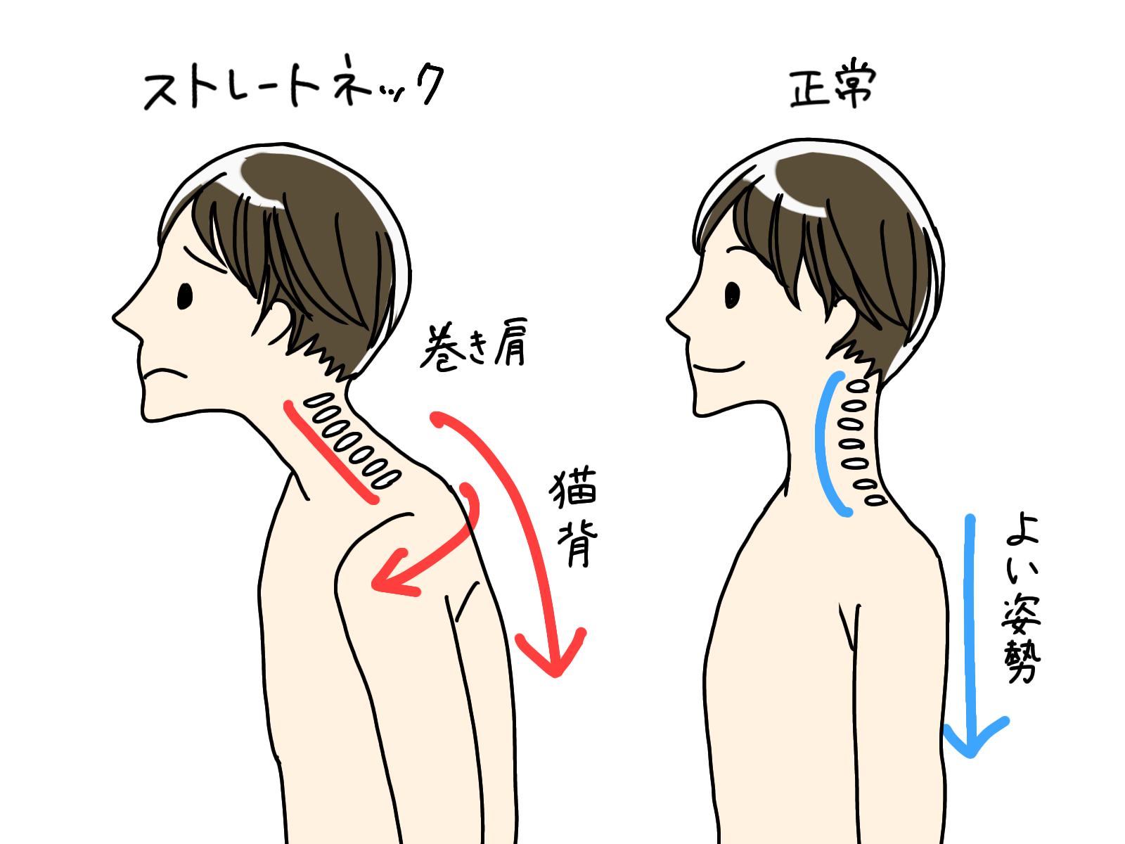 でも、あご出し姿勢をすると、そのカーブがなくなり、6kg前後ある頭の重さをうまく分散できず、首や肩に負担がかかります。