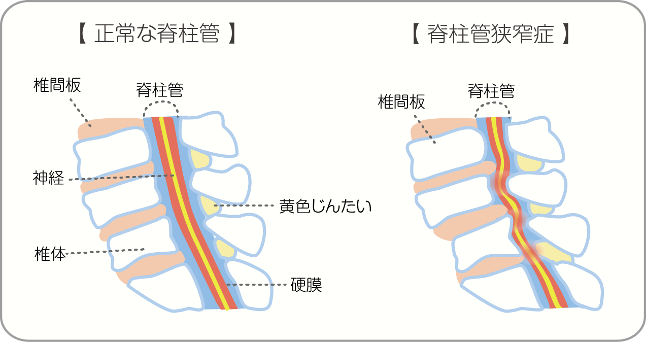 ヘルニアや椎体すべり、骨棘(骨のとげ)、脊柱管の周りにある靱帯がたわんで挟まれるなど、構造的な原因もありますが