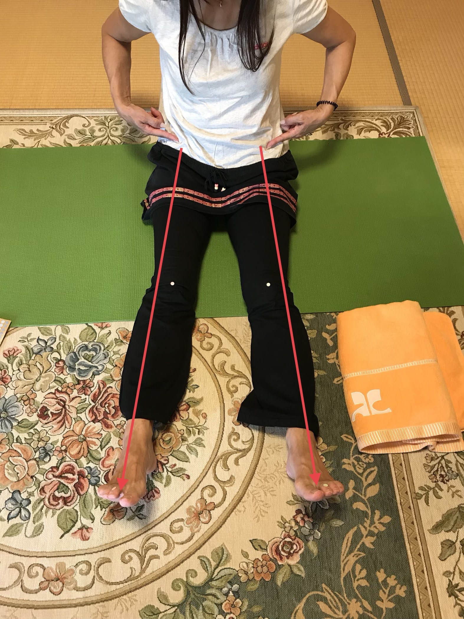 そして、伸ばした脚を見ると、左右とも膝が内側に入っています